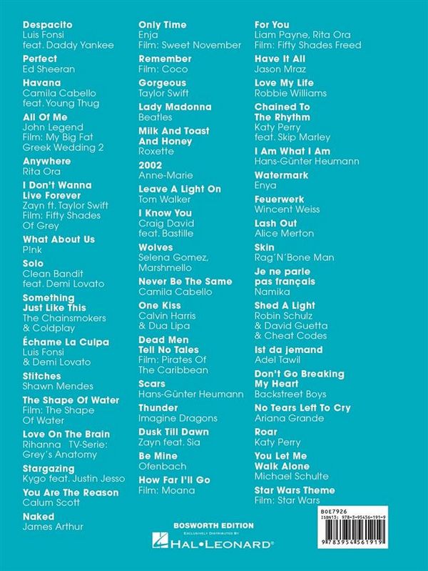 Der achte Band unserer beliebten Reihe Piano gefällt mir! enthält eine Auswahl von 50 aktuellen Charthits und Filmsongs. Alle Titel wurden von Hans-Günter Heumann wie gewohnt leicht arrangiert und bieten ein unkompliziertes Spielvergnügen für Anfänger, Wiedereinsteiger und Fortgeschrittene. Ein weiterer Pluspunkt des Songbooks ist die praktische Spiralbindung. Die Titelliste umfasst eine große Auswahl an populären Charthits, wie Skin (RagnBone Man), Roar (Katy Perry), Perfect (Ed Sheeran), Wolves (Selena Gomez & Marshmello), What About Us (P!nk), Feuerwerk (Wincent Weiss), Thunder (Imagine Dragons), Gorgeous (Taylor Swift ), Ist da jemand (Adel Tawil).Dazu kommen bekannte Film- und Serienmusiken aus u.a. Coco, Star Wars sowie The Shape Of Water, Moana oder Greys Anatomy. Alle Songs sind mit Tempoangaben, Akkordsymbolen und dem Text versehen. Heumann, Hans-Günter, arr. 50 Chart- und Film-Hits Von Luis Fonsi bis Star Wars Despacito LUIS FONSI FEAT DADDY YANKEE Perfect ED SHEERAN Havana CAMILA CABELLO FEAT YOUNG THUG All Of Me JOHN LEGEND Film: MY BIG FAT GREEK WEDDING Anywhere RITA ORA I Don't Wanna Live Forever ZAYN FEAT TAYLOR SWIFT Film: FIFTY SHADES DARKER What About Us P!NK Solo CLEAN BANDIT FEAT DEMI LOVATO Something Just Like This THE CHAINSMOKERS & COLDPLAY Échame la culpa LUIS FONSI & DEMI LOVATO Stitches SHAWN MENDES The Shape Of Water Film: THE SHAPE OF WATER Love On The Brain RIHANNA TV-Serie: GREY'S ANATOMY Stargazing KYGO FEAT JUSTIN JESSO You Are The Reason CALUM SCOTT Naked JAMES ARTHUR Only Time ENYA Film: SWEET NOVEMBER Remember Me Film: COCO Gorgeous TAYLOR SWIFT Lady Madonna THE BEATLES Milk And Toast And Honey ROXETTE ANNE-MARIE Leave A Light On TOM WALKER I Know You CRAIG DAVID FEAT BASTILLE Wolves SELENA GOMEZ & MARSHMELLO Never Be The Same CAMILA CABELLO One Kiss CALVIN HARRIS & DUA LIPA Dead Men Tell No Tales Film: PIRATES OF THE CARIBBEAN: DEAD MEN TELL NO TALES Scars HANS-GÜNTER HEUMANN Thunder IMAGINE DRAGONS Dusk Till Dawn ZAYN FEAT SIA Be Mine OFENBACH How Far I'll Go Film: MOANA For You LIAM PAYNE & RITA ORA Film: FIFTY SHADES FREED Have It All JASON MRAZ Love My Life ROBBIE WILLIAMS Chained To The Rhythm KATY PERRY FEAT SKIP MARLEY I Am What I Am HANS-GÜNTER HEUMANN Watermark Film: MADAGASCAR : FLUCHT DURCH EUROPA Feuerwerk WINCENT WEISS Lash Out ALICE MERTON Skin RAG'N'BONE MAN Je ne parle pas français NAMIKA Shed A Light ROBIN SCHULZ, DAVID GUETTA & CHEAT CODES Ist da jemand ADEL TAWIL Don't Go Breaking My Heart BACKSTREET BOYS No Tears Left To Cry ARIANA GRANDE Roar KATY PERRY You Let Me Walk Alone MICHAEL SCHULTE Star Wars Theme Film: STAR WARS