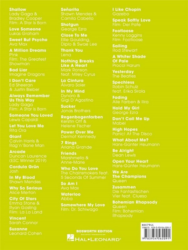 Von Lady Gaga bis Bohemian Rhapsody - Das ultimative Spielbuch für Klavier Der neunte Band unserer beliebten Reihe Piano gefällt mir! enthält eine Auswahl von 50 aktuellen Charthits und Filmsongs. Alle Titel wurden von Hans-Günter Heumann wie gewohnt leicht arrangiert und bieten ein unkompliziertes Spielvergnügen für Anfänger, Wiedereinsteiger und Fortgeschrittene. Ein weiterer Pluspunkt des Songbooks ist die praktische Spiralbindung. Die Titelliste umfasst eine große Auswahl an populären Charthits, wie A Million Dreams (P!nk), Vincent (Sarah Connor), Speak Softly Love(Film: Der Pate), Yesterday (Beatles), High Hopes (Panic at the Disco), We Are The Champions (Queen). Dazu kommen bekannte Film- und Serienmusiken aus u.a. La La Land, Der Pate sowie Bohemian Rhapsody oder auch 'Dr. Schiwago'. Alle Songs sind mit Tempoangaben, Akkordsymbolen und dem Text versehen. Von Lady Gaga bis Bohemian Rhapsody Shallow LADY GAGA & BRADLEY COOPER, FILM: A STAR IS BORN Love Someone LUKAS GRAHAM Sweet But Psycho AVA MAX A Million Dreams P!NK, FILM: THE GREATEST SHOWMAN Bad Liar IMAGINE DRAGONS I Dont Care ED SHEERAN & JUSTIN BIEBER Always Remember Us This Way LADY GAGA, FILM: A STAR IS BORN Someone You Loved LEWIS CAPALDI Why So Serious ALICE MERTON Let You Love Me RITA ORA Giant CALVIN HARRIS & RAGNBONE MAN Arcade DUNCAN LAURENCE, ESC-WINNER Cordula Grün JOSH In My Blood SHAWN MENDES Señorita SHAWN MENDES & CAMILA CABELLO City Of Stars RYAN GOSLING & EMMA STONE, FILM: LA LA LAND Vincent SARAH CONNOR Suzanne LEONARD COHEN Shotgun GEORGE EZRA Close To Me ELLIE GOULDING, DIPLO & SWAE LEE Thank You LENA Nothing Breaks Like A Heart MARK RONSON FEATMILEY CYRUS La Cintura ÁLVARO SOLER In My Mind DYNORO & GIGI DAGOSTINO Sucker JONAS BROTHERS Regenbogenfarben KERSTIN OTT & HELENE FISCHER Power Over Me DERMOT KENNEDY Rings ARIANA GRANDE Friends MARSHMELLO & ANNE-MARIE Who Do You Love THE CHAINSMOKERS FEAT SECONDS OF SUMMER So Am I AVA MAX Somewhere My Love (Laras Theme), FILM: DRSCHIWAGO Waterloo ABBA I Like Chopin GAZEBO Footloose KENNY LOGGINS, FILM: FOOTLOOSE Speak Softly Love, FILM: DER PATE Sailing ROD STEWART A Whiter Shade Of Pale PROCOL HARUM Dont Call Me Up MABEL Speechless ROBIN SCHULZ FEATERIKA SIROLA Fading ALLE FARBEN & ILIRA Hold My Girl GEORGE EZRA Yesterday THE BEATLES High Hopes PANIC! AT THE DISCO What About Me? HANS-GÜNTER HEUMANN Open Your Heart HANS-GÜNTER HEUMANN Be Alright DEAN LEWIS We Are The Champions QUEEN Zusammen DIE FANTASTISCHEN VIER FEATCLUESO Bohemian Rhapsody QUEEN, FILM: BOHEMIAN RHAPSODY