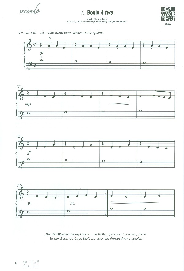 33 popsoundige Originalkompositionen für 2 Spieler an einem Klavier von sehr leicht bis etwas schwieriger. Boule /4 two/ . Big Deal Violas Song Dreaming Goin Easy La Lu Na Tea For Three Fearless Valentinos Argentinello It's Raining Cats (And Dogs) /4 two/ De Rien Drei Klänge /4 two/ Mariva /4 two/ Miles Away38 Binnen Pretje Road No. 3 - /4 two/ Melancolia (Song without words) Singing In The Train Jennys Last Dance Lüc van Glück Secrets Love Prelude Four Friends Getting Stronger New Home Angies Song (Sans Paroles) Play Time RunnersLow So? Why Na Und Peaceful Life Chapeau