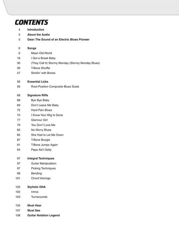 The Ultimate Guitar Lesson Study the trademark songs, licks, tones, and techniques of electric blues pioneer T-Bone Walker. This comprehensive book with audio provides detailed analysis of Walker's guitars, techniques, styles, songs, licks, riffs, and much more. You'll learn everything you need to know about his legendary guitar playing through the music that was such a big influence on guitarists like B.B. King, Chuck Berry, and Eric Clapton. The price of this book includes a unique code that provides access to audio tracks and extra content online, for download or streaming. The tracks include PLAYBACK+, a multi-functional audio player that allows you to slow down audio without changing pitch, set loop points, change keys, and pan left or right - available exclusively from Hal Leonard.