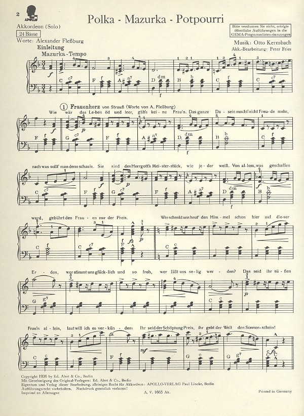 Frauenherz Ist denn kein Stuhl da Drunten im Unterland Zu Augsburg im gold'nen Stern Hans und Gretchen Die schöne Polin Jetzt gang i ans Brünnele Kommt a Vogerl geflogen Arm in Arm Ich setz den Fall Im schönen Elbflorenz Mazurka La Czarine Rosenstock holderblüt O wie so trügerisch