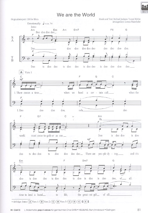 Maierhofer, Lorenz, ed Rock - Pop - Evergreen 77 populäre Chorhits Live is Life Ding-A-Dong We are the Champions Perfekte Welle Nie genug Ba-Ba-Banküberfall Mah-na-ma-na Ich wollt, ich wär ein Huhn Rock for Fun The Entertainer Un poquito Samba The Scat Calypso Jamaica Farewell Mas que nada Beyond the Sea An Englishman in New York We are the World Earth Song Down by the River Let it be Wir machen Musik Conquest of Paradise Can You Feel the Love Tonight The Rose Girls, Girls, Girls Drück die 1 Das Beste L.O.V.E. I'll be There Deine Liebe und mein Lied One More Night Let Your Love Flow / Ein Bett im Kornfeld Das Rendezvous Barbara Ann Que sera, sera Marmor, Stein und Eisen bricht /Marble Breaks and Iron Bends Macho Macho Kling Klang Männer mag man eben Rote Lippen soll man küssen / Lucky Lips Twist and Shout Help Me make it through the Night / Gö, du bleibst heut Nacht bei mir Und wenn ein Lied Looking in Your Eyes Again Bright Eyes Bel ami / So Do I Love is a Flame City of My Heart Something Stupid Caravan of Love Aber dich gibt's nur einmal für mich / Heart of Gold Ausgerechnet Bananen Lollipop Pop four voices Mambo Breaking up is Hard to Do Hit the Road, Jack When the Moon is on the Run You're a Song to Me (Song for Mirjam) Übern See (Heut' ist so ruhig der See) My Way Dieser Weg I have a Dream Über den Wolken Griechischer Wein I'll be There for You Du hast'n Freund in mir Blues and Trouble The Longest Time A Friend Gute Nacht, Freunde You're a Friend The Sound of Silence Tears in Heaven Angels Heast as net Heimweh (Schön war die Zeit) / Memories are made of This Time to Leave