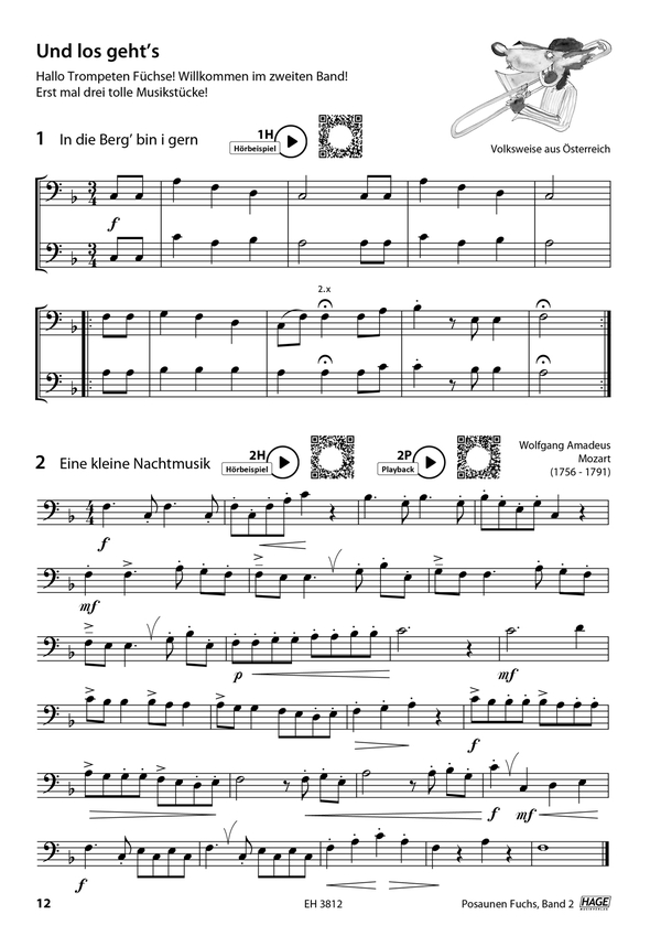 Spielerisch und mit Begeisterung wird in Band 2 die methodischdidaktische Linie aus Band 1 fortgesetzt. Wichtig ist dabei der kontinuierliche Fortschritt, sowie die Erarbeitung verschiedener musikalischer und stilistischer Fähigkeiten. Viele bekannte Lieder und Duette helfen dabei, den Ansatz, die Spieltechnik, sowie die Musikalität wesentlich zu verbessern. Mit über 120 tollen Hörbeispielen und Playbacks macht es Spaß zu spielen. Die Audiobeispiele sind per QR-Code angeführt, die man ganz einfach über Smartphone oder Tablet abspielen kann. Die Titel wurden von Jan Ströhle eingespielt. Alle Übungen können natürlich auch ohne Playback gespielt werden. Der Posaunen Fuchs gehört mittlerweile zu den erfolgreichsten Posaunenschulen der letzten Jahre. Die komplette Schule umfasst 2 Bände. Ideal für den Einzel- oder Gruppenunterricht und das Selbststudium. Internationale Spitzenlehrer empfehlen diese Schule. Warum? Weil das Konzept des Posaunen Fuchs wirklich funktioniert. Unzählige tolle Solostücke und Duette, musikalisch wertvolle Etüden, technische-, flexibilitäts- und ansatzaufbauende Übungen sowie ein lyrisch-sanglicher Zugang zur Kunst des Posaunenspiels tragen mit dazu bei, dass die Schüler nicht nur gut spielen, sondern auch gut klingen. Als ideale Ergänzung zu Band 1 und Band 2 gibt es ein Spielbuch mit 75 beliebten Spielstücken in Duett- und Trioform. Das ausgefuchste Lehrkonzept ist auch für Trompete, Flügelhorn, Klarinette, Tuba, B- und F-Horn erhältlich.