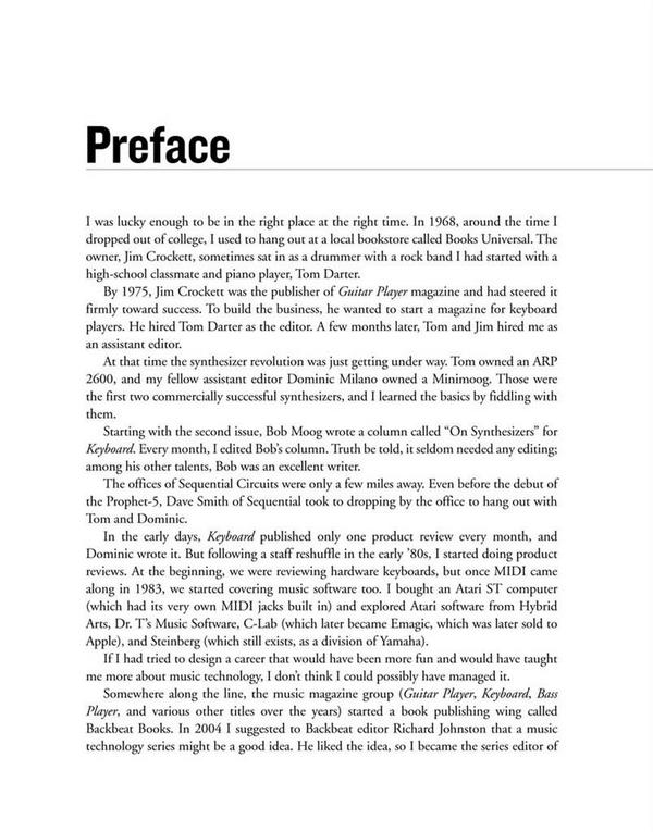 If you make any type of electronic music - dance mixes, hip-hop, jazz fusion, country pop, film soundtracks, or experimental avant-garde - Power Tools for Synthesizer Programming is the book for you. All too often, owner's manuals tell you what button to press, but fail to explain what's actually going on in the instrument or what it means musically and technically. This is the only book that gives you the big picture while at the same time providing you with insightful details. Even if you're just grabbing presets to play on the keyboard, you'll get to the music faster thanks to the tips in this book. And when you start editing the presets or designing your own sounds, Power Tools for Synthesizer Programming becomes an essential resource. Chapters on oscillators, filters, envelope generators, LFOs, effects, and digital audio reveal how to get the most out of your instruments. To supplement the text, dozens of new illustrations have been added, and more than 30 streaming online videos, narrated by the author, walk you through the operational details of numerous software instruments. If you've ever wanted to spend quality time with a synthesizer expert, you'll never have a better opportunity!
