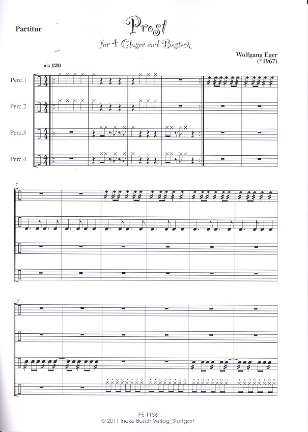 | Untertitel: | für 4 Percusssionisten (mit 4 Trommeln, 4 Gläsern und Besteck) Partitur und Stimmen |