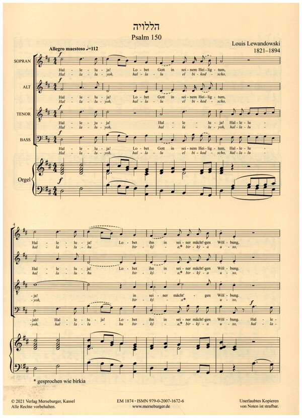 Synagogalmusik Alkan, Charles-Valentin, Koautor Forciniti, Martin, ed Wenn man den Text von Psalm 150 ansieht, erstaunt es nicht, dass dieser immer wieder von Komponisten verschiedenster Herkunft und Epoche vertont wurde. Louis Lewandowski (1821-1894) gelang es am besten, traditionelle Elemente mit deutsch-romantischen Klängen zu verbinden. Lewandowski benutzte die Orgel hauptsächlich als Stütze für den Chor. Wie zentral die Rolle des 150. Psalms ist, zeigt die Tatsache, dass er zu Lewandowskis Werken gehört, die wahlweise deutsch oder hebräisch gesungen werden können. Ganz anders präsentiert sich der französische Musiker Alkan (eigentlich Charles-Valentin Morhange, 1813-1888). Er war ein Wunderkind und erstaunlicher Klaviervirtuose. Seine Kompositionen sind technisch meist von ungeheurer Schwierigkeit, oft benutzt er Klänge, die seiner Zeit weit voraus und gelegentlich geradezu bizarr sind. Eine Bearbeitung dieser Kompositionen für 3-stimmigen Chor und Orgel von Martin Forciniti erscheint unter der Editionsnummer EM 1875.