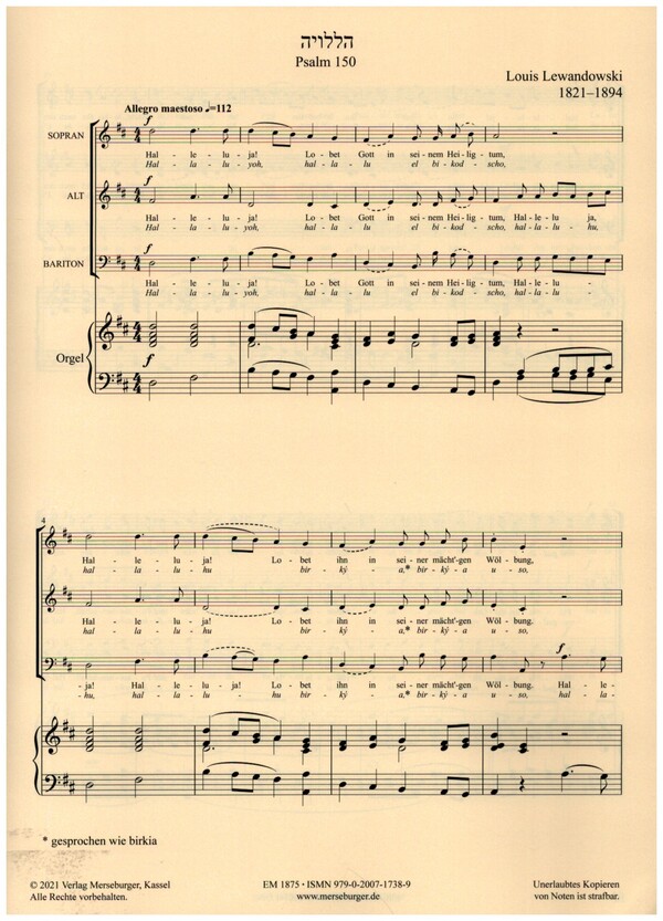 Synagogalmusik Alkan, Charles-Valentin, Koautor Forciniti, Martin, ed Wenn man den Text von Psalm 150 ansieht, erstaunt es nicht, dass dieser immer wieder von Komponisten verschiedenster Herkunft und Epoche vertont wurde. Louis Lewandowski (1821-1894) gelang es am besten, traditionelle Elemente mit deutsch-romantischen Klängen zu verbinden. Lewandowski benutzte die Orgel hauptsächlich als Stütze für den Chor. Wie zentral die Rolle des 150. Psalms ist, zeigt die Tatsache, dass er zu Lewandowskis Werken gehört, die wahlweise deutsch oder hebräisch gesungen werden können. Ganz anders präsentiert sich der französische Musiker Alkan (eigentlich Charles-Valentin Morhange, 1813-1888). Er war ein Wunderkind und erstaunlicher Klaviervirtuose. Seine Kompositionen sind technisch meist von ungeheurer Schwierigkeit, oft benutzt er Klänge, die seiner Zeit weit voraus und gelegentlich geradezu bizarr sind. Eine Bearbeitung dieser Kompositionen für 3-stimmigen Chor und Orgel von Martin Forciniti erscheint unter der Editionsnummer EM 1875.