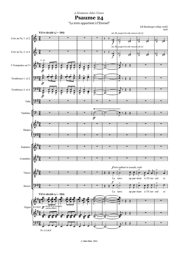 Psalm 24 Die Vertonung dieses Psalms ist ein Ausdruck von Lili Boulanger's tiefer Religiosität. Kraftvoll, dabei sensibel, emotional und doch insgesamt sehr authentisch ? ein überzeugendes Beispiel von Lili Boulangers ganz eigener Tonsprache, die sie schon in so jungen Jahren geprägt hat. ?La terre appartient à l? Eternel? (""The earth is the Lord's"") ? eine im Gegensatz zu den beiden anderen Psalmvertonungen Boulangers ganz diesseitsgewandte Aussage, die wie ein leidenschaftliches Bekenntnis gestaltet wird. Erst 1924, sechs Jahre nach ihrem Tod, wurde das Werk bei Durand in Paris veröffentlicht. Sie setzte den Psalm 24 für vierstimmigen gemischten Chor, Orgel und anstelle eines traditionell besetzten Orchesters für Blechbläser (4 Hörner, 3 Trompeten, 4 Posaunen, 1 Tuba), Pauken und zwei Harfen. Wie aus Lili Boulanger?s Werken bekannt, gebraucht sie instrumentale Kontraste zur Unterscheidung der formalen Abschnitte. Die a-cappella Abschnitte zu Beginn sind syllabisch und gewährleisten, dass jedes Wort deutlich vernehmbar ist. In der Verbindung von Musik und Text liegt die Aufmerksamkeit auf der Verständlichkeit des Textes, hier wirken rhythmische Exaktheit und artikulierte Kontrolle neben einem bedächtigen Einsatz der Klangfarbe im Orchester. Daraus entsteht eine sorgfältig ausgearbeitete und damit sehr wirkungsvolle kompositorische Architektur. Neben dem Verständnis von Psalm 24 als persönliche Bitte um Erlösung und den Segen des Herrn gilt besonderes Interesse ihren gewagten Harmonien und ausgereiften Instrumentationstechniken. *** Lili Boulanger (1893-1918) ?Eine Frau, Lilli Boulanger, die 19-jährige Tochter eines Gesangslehrers am Konservatorium, hat den Grand Prix de Rome gewonnen, wobei es das erste Mal in seiner 110-jährigen Geschichte ist, dass eine Frau den heißbegehrten Preis erhielt. Dass unter anderem so bemerkenswerte Komponisten wie Berlioz, Bizet, Gounod, Massenet, Debussy und Charpentier Rompreisträger waren, macht seinen Wert deutlich.? Diese zeitgenössische Pressemeldung zeigt die herausragende Bedeutung der 1893 geborenen Komponistin. Entgegen den damaligen euphorischen Erwartungen hat dies auch über 100 Jahre später noch nicht dazu geführt, sich in der Realität des Konzertbetriebes widerzuspiegeln. Durch ihren frühen Tod im Alter von nur 24 Jahren am 15. März 1918, inmitten der schlimmsten Phase des 1. Weltkriegs, waren die Voraussetzungen kaum vorhanden, überhaupt von der Nachwelt erinnert zu werden. Erschwerend hinzu kamen die Umbruchzeit der 20er Jahre und der 2. Weltkrieg. Ohne die hartnäckige Überzeugungsarbeit ihrer Schwester Nadja Boulanger (1887-1979), die ebenfalls eine erfolgreiche Komponistin war, wäre das Werk dieser genialen jungen Frau vielleicht inzwischen in Vergessenheit geraten. Im Alter von nur 19 Jahren gewann Lili 1913 für die Kantate »Faust et Helene« als erste Frau den ?Grand Prix de Rome?, trotz der Konkurrenz zu namhaften Komponisten und der offenen Frauenfeindlichkeit einiger Jurymitglieder. Ihr Beitrag war mit Abstand der beste unter den Beiträgen. Lili Boulanger gehört mit Debussy, Ravel und Dukas zu den wichtigsten Vertretern des Impressionismus. Trotz ihres nur kurzen Lebens von 24 Jahren entwickelte sie einen charaktervollen Personalstil und schuf mit großer Erfindungskraft unterschiedlichste Werke wie Lieder, Klaviermusik, Opernszenen und Chormusik. Die Verwendung von Ganztonskalen und Pentatonik, mehrdeutigen Tonalitäten und raffinierter, experimenteller Harmonik mit bisweilen bitonalen Andeutungen waren Eigenschaften, die sie mit Debussy teilte. Ihre Betonung der Subtilität durch impressionistische Mittel wie harmonische Mehrdeutigkeit und ihr kluger Einsatz von Klangfarbe und Dynamik führen zu Werken von großer dramatischer Wirkung. Sie war stets darauf bedacht, das Potenzial der Gesangsstimme und der Instrumente voll auszuschöpfen und gezielt einzusetzen. Editorische Hinweise Mehr als 100 Jahre nach der Erstveröffentlichung präsentiert der Inter-Note Verlag die erste moderne Ausgabe dieser herausragenden Komposition. Unsere Ausgabe wurde auf der Grundlage der Erstausgabe von Durand (1924) erstellt, offensichtliche Fehler und Unklarheiten wurden Unklarheiten wurden korrigiert, der Notensatz wurde teilweise an den heutigen Regeln der Textgestaltung und Lesbarkeit angepasst. Unser editorisches Prinzip ?Living Urtext? basiert auf der Erfahrung, dass auch in sorgfältig edierten Ausgaben immer wieder Fehler, Ungenauigkeiten oder Missverständlichkeiten auftauchen, ein URTEXT ist demzufolge nie fertig, sondern bleibt ein lebendiger editorischer Prozess. Da alle unsere Druckausgaben im ?Print-On-Demand? Verfahren hergestellt werden, also nicht in Großauflagen gedruckt werden, können wir immer auf das professionelle feedback der Anwender (Dirigenten, Insturmentalisten, Musikwissenschaftler, Musikpädagogen u.a.) reagieren und dieses in den herausgegebenen Text mit einfließen lassen.
