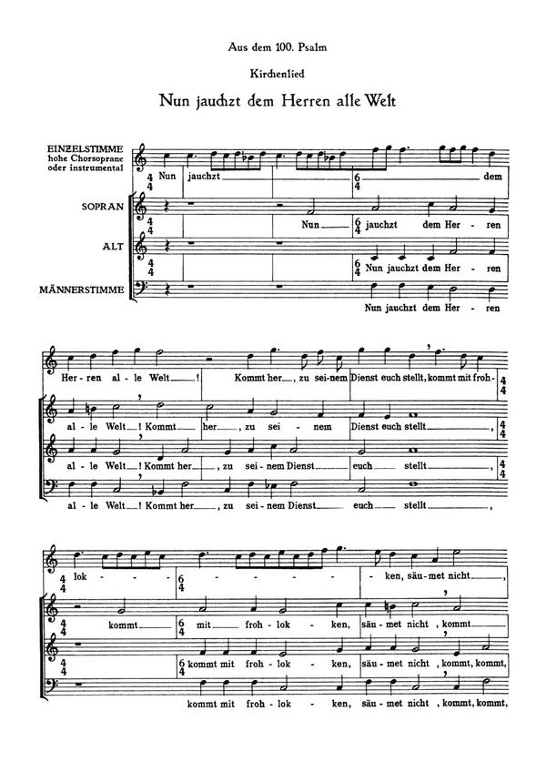 aus "Das Psalmbuch" (1948) Psalm 104. Herr, wie sind deine Werke so groß und viel (SB) Psalm 100. Nun jauchzt den Herren, alle Welt (SSAB) Psalm 92. Das ist ein köstlich Ding (SAMSt) Psalm 40. Es müssen sich freuen (SAMSt) Psalm 103. Nun lob, mein Seel, den Herren (SAT[A]B / Ein Mensch ist in seinem Leben wie Gras (SATB)