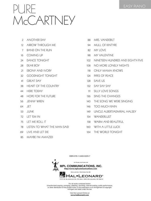 Another Day Arrow Through Me Band On The Run Coming Up Dance Tonight Dear Boy Ebony And Ivory Goodnight Tonight Great Day Heart Of The Country Here Today Hope For The Future Jenny Wren Jet Junk Let 'Em In Let Me Roll It Listen To What The Man Said Live And Let Die Maybe I'm Amazed Mrs. Vandebilt Mull Of Kintyre My Love My Valentine Nineteen Hundred And Eighty-five No More Lonely Nights Only Mama Knows Pipes Of Peace Save Us Say Say Say Silly Love Songs Sing The Changes The Song We Were Singing Too Much Rain Uncle Albert Admiral Halsey Wanderlust Warm And Beautiful With A Little Luck The World Tonight