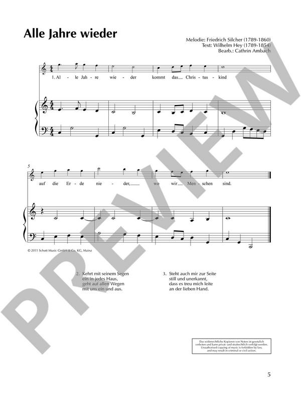 Ambach, Cathrin, arr. Alle Jahre wieder Abendsegen Bald nun ist Weihnachtszeit Der Winter Engel lassen laut erschallen Es wird schon gleich dunkel Feliz Navidad Fröhliche Weihnacht überall Hark! The Herald Angels Sing Herbei, o ihr Gläubigen Hirtensinfonie Ich steh an deiner Krippe hier Ihr Kinderlein, kommet Jingle Bells Joseph, lieber Joseph mein Joy to the World Kommet, ihr Hirten Leise rieselt der Schnee Morgen kommt der Weihnachtsmann O du fröhliche Santa Claus is Comin' to Town Schneeflöckchen, Weißröckchen Stern über Bethlehem Still, still, still Stille Nacht, heilige Nacht The First Nowell Tochter Zion Was soll das bedeuten We Wish You a Merry Christmas Winter Wonderland Wir sagen euch an Zu Bethlehem geboren