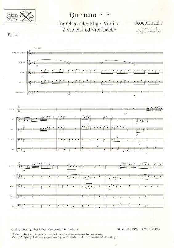 | Untertitel: | für Oboe (Flöte), Violine, 2 Violen und Violoncello Partitur und Stimmen |