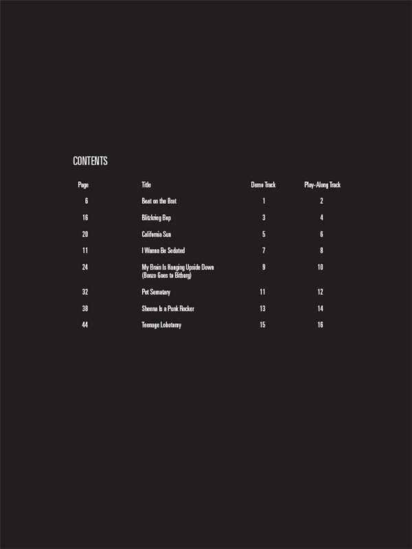 The Guitar Play-Along Series will help you play your favorite songs quickly and easily! Just follow the tab, listen to the CD to hear how the guitar should sound, and then play along using the separate backing tracks. The melody and lyrics are also included in the book in case you want to sing, or to simply help you follow along. The audio CD is playable on any CD player. For PC and Mac computer users, the CD is enhanced so you can adjust the recording to any tempo without changing pitch! 8 songs: Beat On The Brat Blitzkrieg Bop California Sun I Wanna Be Sedated My Brain Is Hanging Upside Down (Bonzo Goes To Bitburg) Pet Sematary Sheena Is A Punk Rocker Teenage Lobotomy