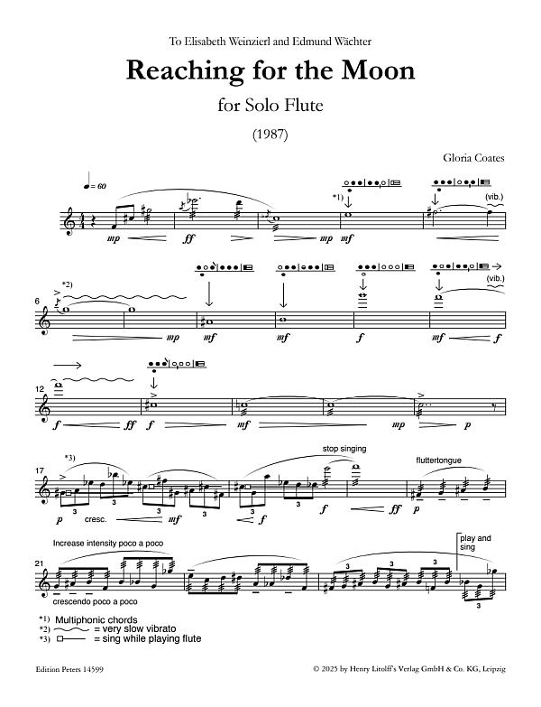 "In 1987/1988 Gloria Coates wrote a solo for alto recorder in collaboration with the recorder player Dörte Nienstedt. Extreme dynamic increases, simultaneous playing and singing, hard accents, fluttering tonguing, multiphonics, upward glissandi and vibrato go beyond the usual framework of music for recorder and led to the title ?Breacking through?. The version for transverse flute was written with Edmund Wächter (premiere 19 October 1988). The main aim was to utilise the greater range of the transverse flute and to transfer the expressive elements. Glissandi and multiphonics in particular demanded new fingerings. As no specific sounds were required for the multiphonics, but the additional notes were to determine the colour and expression of the main tone, there were many possibilities here, which the composer had played for two days in various combinations until she finally found her favoured sounds in this empirical approach. As it was ultimately an independent piece, it was also to be given its own title and after the first performances took place under various names (?Breaking Through III?, ?Breaking out?), ?Reaching for the Moon? finally emerged. Two additional versions with tape were also heard at the premiere: in ?Fiori?, the flute enters into a dialogue with the perking and chattering of the cockatiel of a friend, Princess Maria Josepha of Saxony. And in ?Fiori and the Princess?, the princess also takes an active part in the ?conversation?. Here it becomes clear that ?Reaching for the Moon? was also conceived as ?bird music?, for which Gloria Coates received her first inspiration from a cockatoo in a pet shop. The opening motif (theme) serves as a formative element, which changes in parts and runs through the entire piece in fragments. A twelve-tone row with a song-like rhythm and a ?quasi-sex chord? in a wide register at the beginning corresponds to listening habits, from which one is immediately torn away by fluttering tonguing and multiphonics. This ?theme? can also be found in other flute pieces by Gloria Coates, as a kind of ?leitmotif? for flute: "In 1987/1988 Gloria Coates wrote a solo for alto recorder in collaboration with the recorder player Dörte Nienstedt. Extreme dynamic increases, simultaneous playing and singing, hard accents, fluttering tonguing, multiphonics, upward glissandi and vibrato go beyond the usual framework of music for recorder and led to the title ?Breacking through?. The version for transverse flute was written with Edmund Wächter (premiere 19 October 1988). The main aim was to utilise the greater range of the transverse flute and to transfer the expressive elements. Glissandi and multiphonics in particular demanded new fingerings. As no specific sounds were required for the multiphonics, but the additional notes were to determine the colour and expression of the main tone, there were many possibilities here, which the composer had played for two days in various combinations until she finally found her favoured sounds in this empirical approach. As it was ultimately an independent piece, it was also to be given its own title and after the first performances took place under various names (?Breaking Through III?, ?Breaking out?), ?Reaching for the Moon? finally emerged. Two additional versions with tape were also heard at the premiere: in ?Fiori?, the flute enters into a dialogue with the perking and chattering of the cockatiel of a friend, Princess Maria Josepha of Saxony. And in ?Fiori and the Princess?, the princess also takes an active part in the ?conversation?. Here it becomes clear that ?Reaching for the Moon? was also conceived as ?bird music?, for which Gloria Coates received her first inspiration from a cockatoo in a pet shop. The opening motif (theme) serves as a formative element, which changes in parts and runs through the entire piece in fragments. A twelve-tone row with a song-like rhythm and a ?quasi-sex chord? in a wide register at the beginning corresponds to listening habits, from which one is immediately torn away by fluttering tonguing and multiphonics. This ?theme? can also be found in other flute pieces by Gloria Coates, as a kind of ?leitmotif? for flute: ?Lichtsplitter? for flute, viola and harp (1988) - additionally with percussion ?Microtone Poem? (1988) - additionally with percussion and timpani ?Transfer 482? (1992) ?Märchen Suite?, from which ?Der kleine Däumling? (1987) ?Phantom? for flute and piano (2004) is a duo version of ?Reaching for the Moon? without reprise." ?Lichtsplitter? for flute, viola and harp (1988) - additionally with percussion ?Microtone Poem? (1988) - additionally with percussion and timpani ?Transfer 482? (1992) ?Märchen Suite?, from which ?Der kleine Däumling? (1987) ?Phantom? for flute and piano (2004) is a duo version of ?Reaching for the Moon? without reprise."