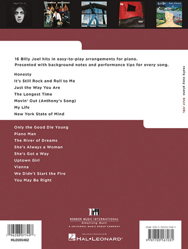 16 iconic hits 1. Honesty [Billy Joel] 2. Its Still Rock And Roll To Me [Billy Joel] 3. Just The Way You Are [Billy Joel] 4. The Longest Time [Billy Joel] 5. Movin Out (Anthonys Song) [Billy Joel] 6. My Life [Billy Joel] 7. New York State Of Mind [Billy Joel] 8. Only the Good Die Young [Billy Joel] 9. Piano Man [Billy Joel] 10. The River Of Dreams [Billy Joel] 11. Shes Always A Woman [Billy Joel] 12. Shes Got a Way [Billy Joel] 13. Uptown Girl [Billy Joel] 14. Vienna [Billy Joel] 15. We Didnt Start the Fire [Billy Joel] 16. You May Be Right [Billy Joel]