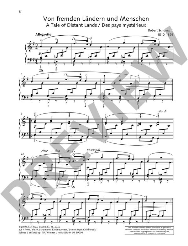 Twelsiek, Monika, Hrsg. Travel Pictures Tableaux de voyage 37 Originalstücke Schumann : Von fremden Ländern und Menschen Tschaikowsky : Deutsches Lied Schubert : Deutscher, genannt Ländler a-Moll D366,3 Schubert : Wiener Damen-Ländler G-Dur op.67,1 Burgmüller : Steirischer Tanz aus Etüden op.100 Schumann : Sizilianisch aus Album für die Jugend op.68 Tschaikowsky : Neapolitanisches Tanzlied Burgmüller : Tarantella aus Etüden op.100 Mendelssohn Bartholdy : Venetianisches Gondellied g-Moll op.19b No. 6 aus Lieder ohne Worte Casella : Siciliana aus 11 Pezzi infantili Takács : Spanische Straßenmusikanten aus Von fremden Ländern und Menschen, op. 37') Albéniz : Malagueña aus España op.165 Turina : Madrid aus Postkarten Rodrigo : Rústica aus Tres Danzas de España Rameau : Tambourin aus Suite en mi Grieg : Norwegisch aus Lyrische Stücke op.12 Chopin : Mazurka g-Moll, op.67,2 Chopin : Polonaise g-Moll Mazurka G-Dur, op. 7/5 Fibich : Furiant Böhmischer Tanz aus Sonatine d-Moll Debussy : Danse bohémienne Bartók : Abend auf dem Lande aus 10 leichte Klavierstücke Ungarische Volksweise No.34 Ungarische Volksweise No.35 Heller : Tziganyi Bohémiens op.138,19 Bartók : Rumänischer Volkstanz No.1 Rumänischer Volkstanz No.4 Tschaikowsky : In einer alten russischen Kirche aus Jugendalbum op. 39') Weiße Nächte (Mai) aus Die Jahreszeiten op.37a Tong Shang : Freundschaft Liebeslied auf der Wiese aus 7 kleine Stücke nach Volksliedern aus der inneren Mongolei') Nazareth : Tango Garôto aus 25 Tangos brasileiros Gershwin : Prelude No. 2 Joplin : The Easy Winners