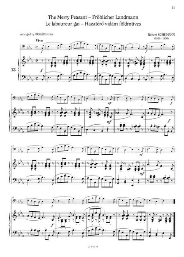 Ariette (Anon) Bransle de la Royne (M. Praetorius) Song Lied chanson dal (C.Ph.E.Bach) At night on the river (Kabalevsky) Nachts am Fluss Old folks at home (Foster) Song (Glinka) Folksong Bee (Bogar) Folkslied Kränzchen Gavotte (Chedeville) Alla tedesca (Haussmann) High flies the crane (Szerdahelyi) Hoch fliegt der Kran Military march (Steiner) Militärmarsch Burlesca (Steiner) The merry peasant (Schumann) Fröhlicher Landmann Sonatina (Vanhal) Ländler (Küffner) Polka (Küffner) German dance (Haydn) Deutsche Tanz Largo (Corelli) German dance (Mozart) Deutscher Tanz POlka (BOgar) Mineut (Telemann) Menuett Rondo (Bonocini) Minuet (Bach) Menuett Excerpt from Peasan't cantata (Bach) Ausschnitt aus der Bauernkantate Gavotte (Händel) Three characters (Bogar) Drei Charaktere Waltz (Weber) Walzer Hungarian dance (Jardanyi) Ungarischer Tanz