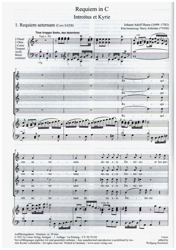 Johann Adolf Hasse, Kapellmeister am sächsisch-polnischen Hof zu Dresden, komponierte das Requiem in C für die feierlichen Exequien des verstorbenen Kurfürsten Frederic August II. im November 1763 in der katholischen Dresdner Hofkirche. Mit diesem Werk hat er seinem langjährigen, generösen Dienstherrn, der zugleich unter dem Namen August III. auch König von Polen war, ein klingendes Denkmal gesetzt. Pathetische Chorsätze, Anklänge an historische Satztechniken, ausdrucksvolle Gesangssoli und Arien, di den Opernkomponisten nicht verleugnen, dazu Trompeten und Pauken im Orchester - das alles sind die Zutaten einer 'königlichen' Totenmesse im Stil einer Missa solemnis.