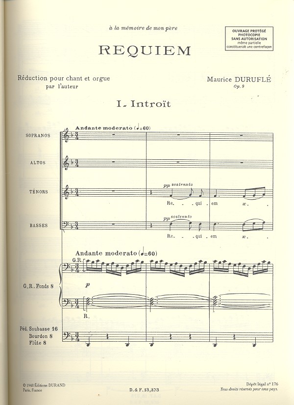 Vocal score of Durufles Requiem Op.9 for Chorus with Orchestra and Organ. This score features a reduction of the orchestral material.