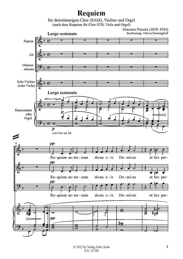 | Untertitel: | für dreistimmigen Chor (SAM), Violine (Viola) und Orgel (Harmonium) Partitur (la) |