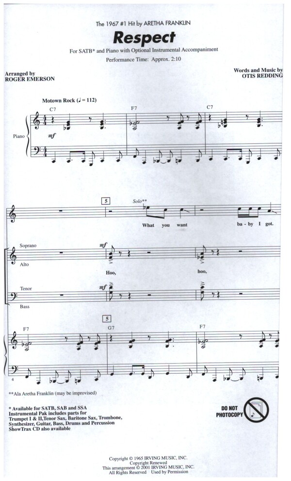 Pop Choral Series Emerson, Roger, arr. Redding, Otis, words You'll bring down the house with this high-powered sizzler! The 1967 #1 hit by Aretha Franklin is a great showcase for a special soloist. Available for SATB, SAB, SSA, Instrumental Pak (Combo) and ShowTrax CD