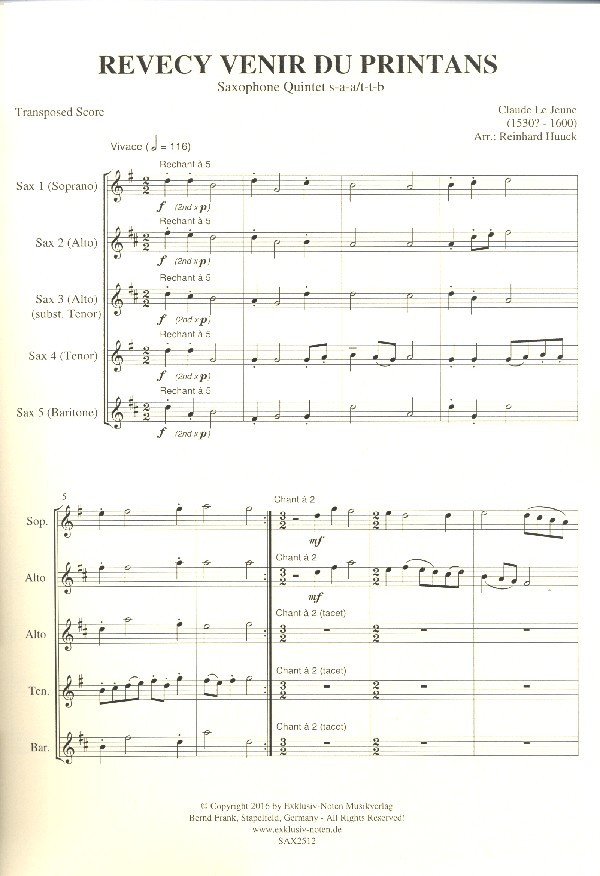 | Untertitel: | für 5 Saxophone (SAA(T)TBar) Partitur und Stimmen |