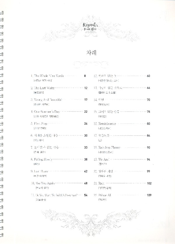 Spiralbindung The whole Nine Yards The last Waltz Young and beautiful First Step Falling slowly See You again Do You want to build a Snowman Reminiscence Raindrop Flower We are Rain Prince Ali and others