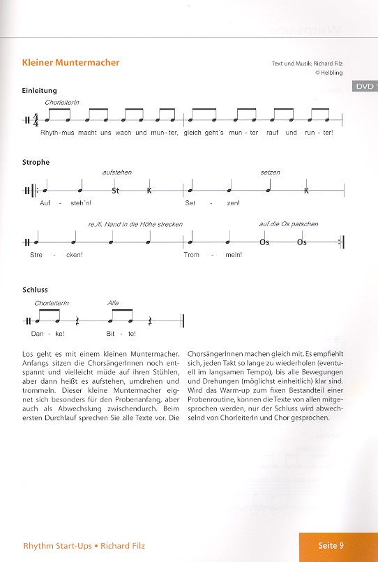Rhythm Start-Ups für Chor und Klasse wendet sich an ChorleiterInnen, LehrerInnen und alle, die mit 9- bis 99-jährigen SängerInnen arbeiten. Wer Spaß und Freude am Entdecken neuer Ansätze und Methoden hat und kreative Anregungen und Ideen sucht, für den bietet sich hier eine große Sammlung von Rhythmus-Stücken. Die Grundlage der motivierenden Rhythmusarbeit bilden abwechslungsreiche und differenzierende Übungen, attraktive Stücke sowie Inhalte und Texte, die alle begeistern. Dabei kommt der ganze Körper als universelles Klang- und Rhythmusinstrument zum Einsatz: Sprechen, Singen, Klatschen, Patschen, Schnipsen, Stampfen - ganzheitliches Musizieren, das Körper und Geist stimuliert und fit für weitere Herausforderungen macht! Das gezielte Chor-Rhythmustraining vom Autoren Richard Filz erhöht die rhythmische Präzision im Vokalensemble. Es fördert die rhythmischen und koordinativen Fähigkeiten der SängerInnen und führt zu einem unbeschwerten Musizieren aufgrund rhythmischer Sicherheit. Das gezielte Training unterstützt bei der Entwicklung von musikalischen Grundkompetenzen wie Puls-, Takt-, Form- und Rhythmusgefühl und verbessert auch die Fähigkeit, ein Tempo zu halten. Rhythm Start-Ups enthält eine DVD mit 53 Videos der Übungen und Stücke. Gerade beim Erlernen der Bewegungsabläufe ist es für ChorleiterIn und SängerIn von unschätzbarem Vorteil, wenn man jedes Detail im Bild beliebig oft ansehen kann.