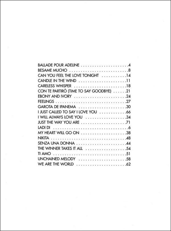 My Best is a collection of the greatest hits by the French pianist Richard Clayderman. Noted by Guinness World Records as being the most successful pianist in the world, Clayderman's oeuvre ishugely extensive and this songbook includes many of his best melodies. BALLADE POUR ADELINE BESAME MUCHO CAN YOU FEEL THE LOVE TONIGHT CANDLE IN THE WIND CARELESS WHISPER CON TE PARTIRO EBONY AND IVORY FEELINGS GAROTA DE IPANEMA I JUST CALLED TO SAY I LOVE YOU JUST THE WAY YOU ARE LADI DI MY HEART WILL GO ON MIKITA SENZA UNA DONNA THE WINNER TAKES IT ALL TI AMO UNCHAINED MELODY WE ARE THE WORLD
