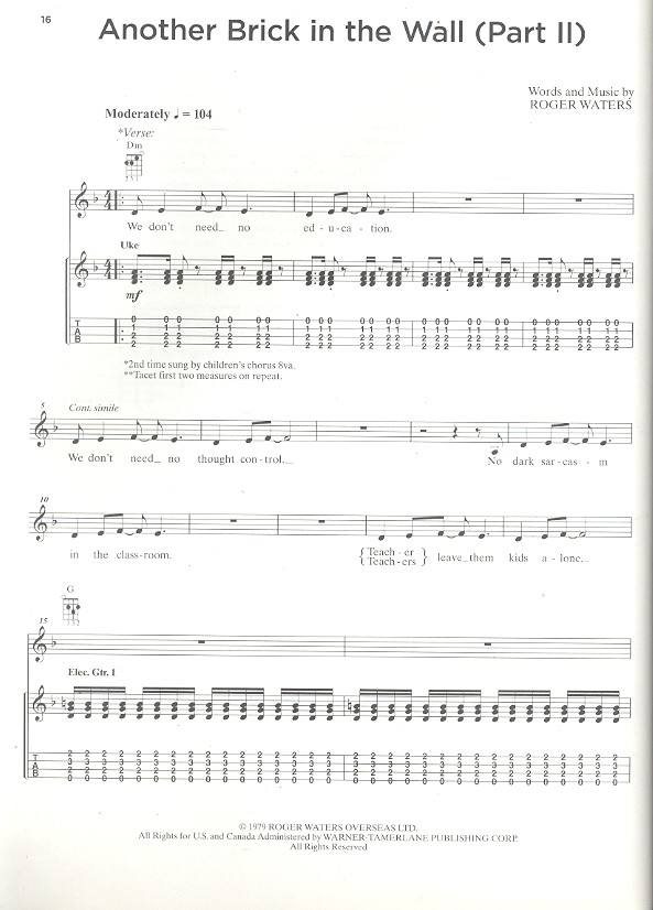 The complete Idiot's Guide to 25 great Rock Hits for Ukulele Another Brick in the Wall BAd to the Bone Big Yellow Taxi Boulevard of broken Dreams Creep Do You want to know a Secret Don't stop believin' Gimme some Lovin' Good Riddance (Time of your Life) Hotel California If You could read my Dreams Layla Long Train runnin' Maggie May Moondance Over the Rainbow Ramblin' Man Sister Golden Hair Soul Man Stairway to Heaven Sunshine of Love Take It easy Tonight You belong to Me Wild Night