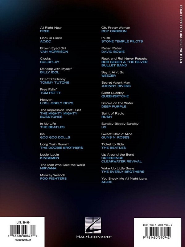 All Right Now (Free) Back In Black (Ac/Dc) Brown Eyed Girl (Morrison, Van) Clocks (Coldplay) Dancing With Myself (Idol, Billy) Free Fallin'(Petty, Tom) Heaven (Adams, Bryan) In My Life (The Beatles) Iris (from the film City Of Angels) (Goo Goo Dolls) Long Train Runnin' (The Doobie Brothers) Louie, Louie (from the film Animal House) (The Kingsmen) Monkey Wrench (Foo Fighters) Oh, Pretty Woman (from the film Pretty Woman) (Orbison, Roy) Plush (Stone Temple Pilots) Rebel, Rebel (Bowie, David) Rock And Roll Never Forgets (Seger, Bob) Say It Ain't So (Weezer) Secret Agent Man (from the Television Series) (Bergeaud, David) Silent Lucidity (Queensrych) Smoke On The Water (Deep Purple) Spirit Of Radio (Rush) The Impression That I Get (The Mighty Mighty Bosstones) The Man Who Sold The World (Bowie, David) Ticket To Ride (The Beatles) Up Around The Bend (Creedence Clearwater Revival) Wake Up Little Susie (The Everly Brothers) You Shook Me All Night Long (Ac/Dc)