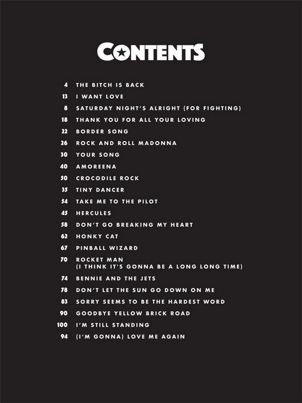 Music from the Motion Picture Soundtrack 22 songs from the Soundtrack matching the Hit new Biopic of 2019 chronicling the Life and Career of Sir Elton John The Bitch is back I want Love Saturday Night's alright (for Fighting) Thank You for all your Loving Border Song Rock and Roll Madonna Your Song Amoreena Crocodile Rock Tiny Dancer Take me to the Pilot Hercules Don't go braking my Heart Honky Cat Pinball Wizard Rocket Man (I think it's gonna be a long long Time) Bennie and the Jets Don't let the Sun go down on me Sorry seems to be the hardest Word Goodbye yellow Brick Road I'm still standing (I'm gonna) love me again