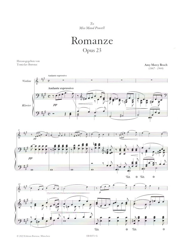 Butorac, Tomislav, ed Unter den mehr als 300 Kompositionen von Amy Beach, der ersten Amerikanerin die eine Symphonie komponiert hat, ragt ihre Romanze op.23 für Violine und Klavier in besonderer Weise hervor: ihre Popularität ist vor allem in den USA bis heute ungebrochen. Bei Edition Butorac erscheint sie nunmehr als Neurevision mit Fingersätzen von Tomislav Butorac. Es wäre zu wünschen, wenn diese Neuausgabe dazu beitragen könnte, diese herrliche Miniatur auch in Europa ein Stück weit bekannter zu machen.