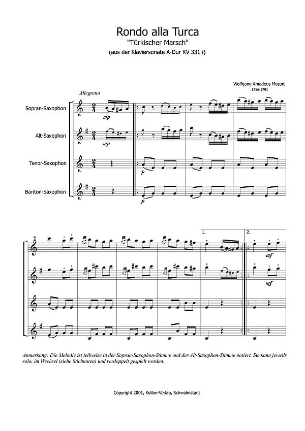 Produktinformationen "Rondo alla turca für 4 Saxophone (SATB)"