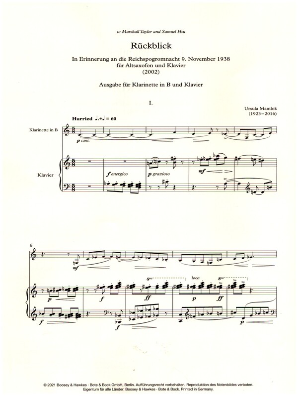 In Erinnerung an die Reichspogromnacht 9. November 1938 Ursula Mamlok hat in ihren Werken die Schoa nicht thematisiert. Eine Ausnahme bildet der Rückblick für Saxophon und Klavier, den sie 2002 im Auftrag der Temple University zur Erinnerung an die Reichspogromnacht schrieb. Stärker als in ihren anderen Werken aus jener Zeit ist der Kontrast zwischen langsamen und schnellen Sätzen herausgearbeitet letztere erhalten etwas Getriebenes, der Klavierpart nimmt für Augenblicke eine sonst nicht gekannte Härte an. Gegen Ende des dritten Satzes werden sangliche und flüchtige Gesten unvermittelt aneinander gedrängt. Der erste schnelle Satz entsteht aus der Zerstörung versuchter Kantabilität. Die Elegie (2. Satz) erstirbt mit einer vierfachen Erinnerung an ihr Anfangsmotiv, der letzte Ansatz bleibt Fragment. Der vierte Satz Lament schließt mit einer Figur, die in ihren Anfang zurückkehrt. Neben der Originalfassung mit Altsaxophon stehen Fassungen mit Bassklarinette bzw. für Klarinette in B zur Verfügung. I. II. Elegy III. IV. Lament