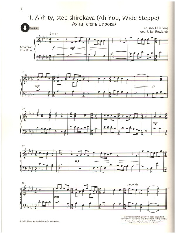 Rowlands, Julian, arr. Julian Rowlands präsentiert eine Sammlung von 27 Bearbeitungen russischer Volksweisen für Akkordeon. Bekannte Stücke wie Ochi Chyoryne und Kalinka stehen neben unbekannteren Werken, die es zu entdecken gilt. Die Ausgabe enthält Informationen über die Geschichte der russischen Volksmusik sowie Hinweise zu den einzelnen Stücken (englisch). Die deutschen und französischen Übersetzungen der Texte stehen als PDF zur Verfügung. Alle Stücke wurden eingespielt und können kostenlos heruntergeladen werden.