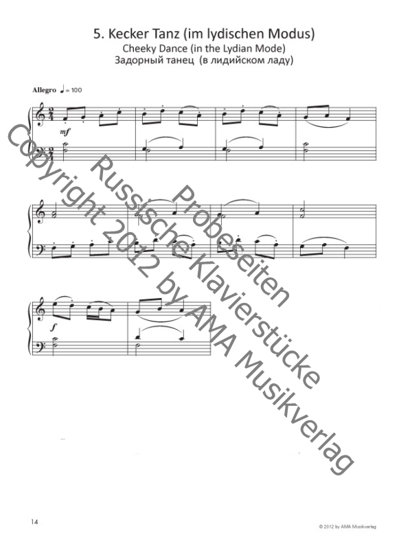 49 musialische Bilder Erste Schritte des Pianisten: Monodie der rechten Hand Monodie der linken Hand Einträchtiges Duett Fröhlicher Tanz in Dur Kecker Tanz (im lydischen Modus) Sanfter Tanz (im mixolydischen Modus) Trauriges Lied in Moll Lyrisches Motiv (im äolischen Modus) Schwermütiges Motiv (im dorischen Modus) Kämpferisches Motiv (im phrygischen Modus) Kanon Doppelter Kontrapunkt Kleine Fuge Sommertag eines Kindes: Der Morgen Lebhafter Spaziergang Bitteres Ärgernis Seltsames Geschehnis Fangspiel Fantastisches Kino In trauriger Stimmung Lied in einem Boot auf dem Fluss Der Zauberwald Vogelgesang im Wald Der schreckliche Reiter Es regnet Jägermarsch (Rondo) Frohes Festmahl Walzer (für 4 Hände) Polka (für 4 Hände) Abendgebet Wiegenlied Musikalische Reise durch Länder und Kontinente: Amerikanisches Lied Russischer Tanz Argentinischer Tanz Chinesische Landschaft Afrikanische Talking Drums Arabische Derwische wandern durch die Wüste Trauriges hebräisches Lied Furiant (Böhmischer Volkstanz) Ungarischer Marsch Zigeunertanz Mazurka (Polnischer Tanz) Englisches Lied Lied eines französischen Troubadours Spanisches Lied Italienische Kanzone Schottischer Tanz Deutsches Lied Fröhlicher Marsch Der erste Zyklus richtet sich an Anfänger, die ihre allererste Bekanntschaft mit der Klaviatur machen. Zunächst lernen sie das Spielen einfacher Melodien im Stil mittelalterlicher Gesänge: anfangs rechte und linke Hand separat, dann zusammen, jedoch mit dem gleichen Fingersatz. Danach werden den jungen Musikern verschiedene Tonarten der Volks-, der Mittelalter- und der Renaissancemusik beigebracht. Am Zyklusende spielen die Kinder dann einfache polyphone Stücke in der Form des Kanons, doppelten Kontrapunkts und der 3-stimmigen Fuge. Der zweite Zyklus Sommertag eines Kindes ist für die Musikschüler der Mittelstufe konzipiert. Hier werden die widersprüchlichen Stimmungen und Bilder nachgezeichnet, die eine sensible Kinderseele im Verlaufe eines ganzen Tages vom frühen Morgen bis zum späten Abend begleiten. Die stilistische Gestaltung dieser Stücke ist frei und nicht nachstilisiert. Insgesamt lehnt sich der Zyklus an das von mir seit meiner Kindheit so geliebte Album für die Jugend von Robert Schumann an und ist diesem von mir so geschätzten Komponisten gewidmet. Der dritte Zyklus heißt Musikalische Reise durch Länder und Kontinente. Darin habe ich mich bemüht, die kontrastreichen melodischen, rhyth¡mischen und harmonischen Besonderheiten der einen oder anderen Volksmusik wiederzugeben. Russische Klavierstücke - 49 musikalische Bilder Sergei Slonimsky, der für sein musikalisches Schaffen und sein pädagogisches Engagement mehrfach ausgezeichnet wurde, unterrichtete seit 1959 am Konservatorium St. Petersburg das Fach Komposition. 1976 erhielt er seine Berufung als Professor. Sein kompositorisches Schaffen umfasst alle Genres und Formen der klassischen Musik: 5 Oper, 3 Ballettwerke (u. a. Die Zaubernuss 2005), ein Requiem, zahlreiche Kammermusik- und Chorwerke, Film- und Theatermusik und mehrere Vokalzyklen nach russischen Dichtern wie Block, Akhmatova und Brodsky. Die vorliegende Sammlung enthält drei Zyklen aus kurzen Klavierstücken, die sowohl künstlerischen als auch pädagogischen Ansprüchen gerecht werden und sich an Anfänger wie fortgeschrittene Pianisten richtet. Der erste Abschnitt richtet sich an Anfänger, die sich erst mit dem Klavier vertraut machen. Dabei gelingt es dem Komponisten mit leichten Melodien im Stil von mittelalterlichen Gesängen und einfachen Fingersätzen den jungen Musikern auch schon die verschiedenen Tonarten der Volks-, Mittelalter- und Renaissance-Musik näherzubringen. Am Ende dieses Abschnitts können die Kinder einfache polyphone Stücke in Form des Kanons oder des doppelten Kontrapunkts vortragen. Die Kompositionen des zweiten Zyklus Sommertag eines Kindes lehnen sich an das Album für die Jugend von Roman Schumann an und zeichnen musikalisch die widersprüchlichen Stimmungen einer Kinderseele nach, die diese im Laufe eines Tages erlebt. Im dritten Zyklus Musikalische Reise durch Länder und Kontinente werden kontrastreiche melodische, rhythmische und harmonische Besonderheiten von unterschiedlichen Volksmusiken verarbeitet. In den progressiv angeordneten kleinen Werken finden Kinder und Erwachsene, Anfänger und Wiedereinsteiger gleichermaßen exzellentes neues Spielmaterial, das durch eine, von Mitgliedern des befreundeten Klaviertrios Some Handsome Hands, neu eingespielte CD komplettiert wird.