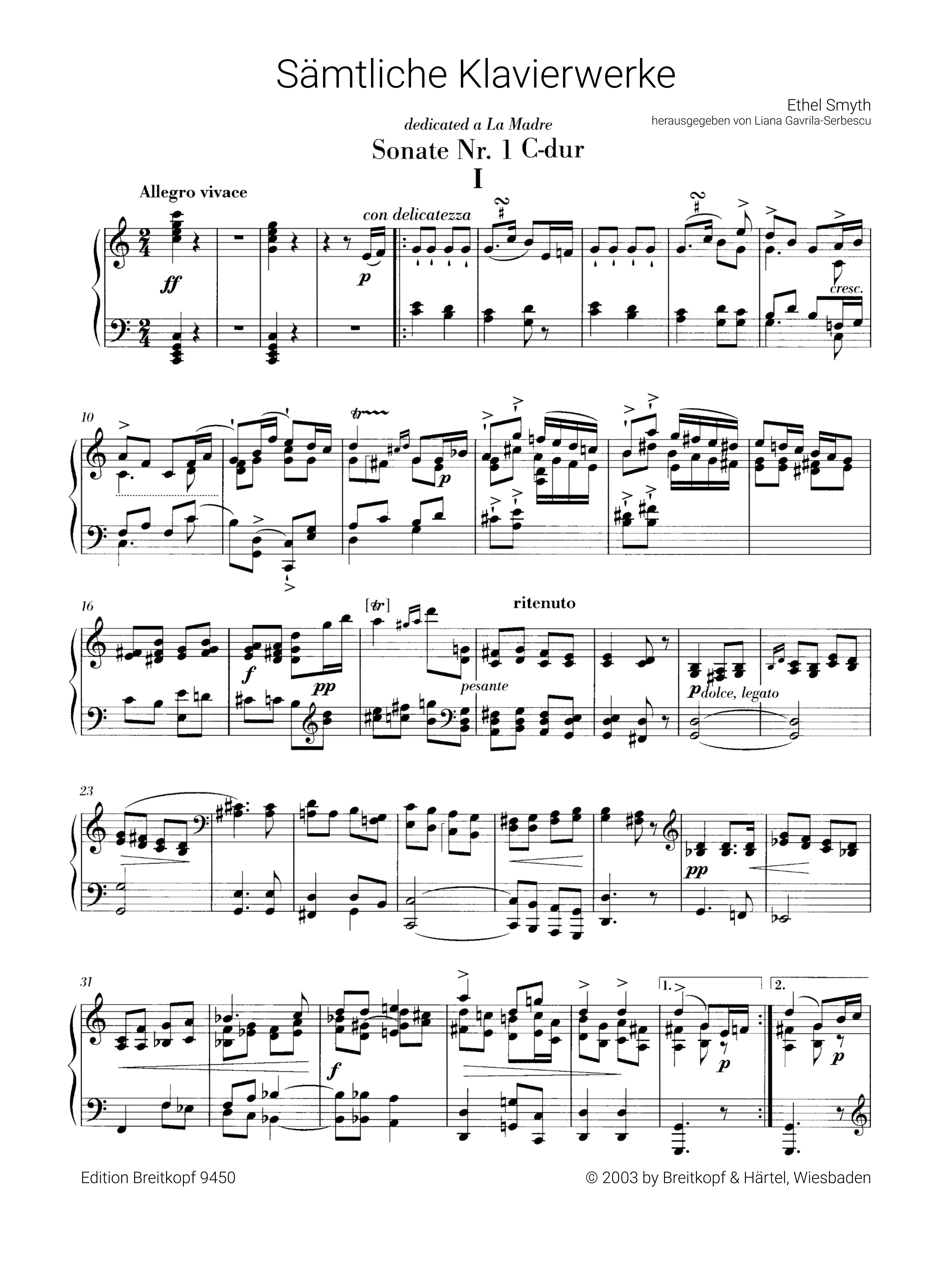 Sonaten, Einzelne Klavierstücke, Variationen Gavrila-Serbescu, Liana, ed Sonate Nr. 1 C-dur Sonate Nr. 2 cis-moll Sonate Nr. 3 D-dur Klavierstück in E-dur Aus der Jugendzeit!! E. v. H. Vier Tänze Suite Nocturne (Kanon in Gegenbewegung) Kanon in Gegenbewegung mit einer Füllstimme Kanon in Gegenbewegung mit Begleitung Invention Praeludium [C-dur] Fuga a 3 [C-dur] Praeludium [Fis-dur, komponiert von Heinrich von Herzogenberg, irrtümlich Ethel Smyth zugeschrieben] Fuga [Fis-dur, komponiert von Heinrich von Herzogenberg, irrtümlich Ethel Smyth zugeschrieben] Variationen in Des-dur über ein eigenes Thema
