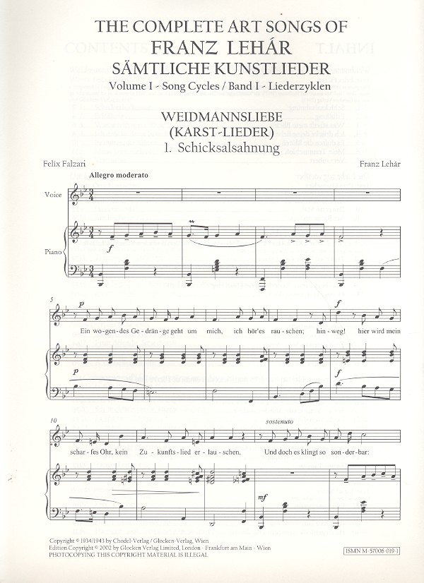 Lamb, A., ed Weidmannsliebe (8 Karst-Lieder) op.26 Falzari, Felix, Texte : Schicksalsahnung Erfüllung Was streift mein Blick Ich drücke deine liebe Hand Es duften die Blüten Mein Traumschloß - versunken Verzaubert / Die Liebe zog vorüber (Eisenschitz, O., Text) : Ich war sein Mädel Das erste Mal Am Bache im Gras / Aus eiserner Zeit (Liederzyklus) : Trutzlied (Löhner) Ich hab' ein Hüglein im Polenland, Frauenlied (Dankwart-Zwerger) Nur einer (Oesteren, Fr. W., von) Was liegt daran ? Reiterlied 1914 (Zuckermann) Fieber (E. Weill) / Amours (Dunan, M., Text) : Sans phrases Fruit defendu Ce soir la chambre est vide A Versailles / Les compagnons d'Ulysse numeros musicaux du roman de Pierre Benoit (Maprey und Geiringer, Texte) : Sur le ch'min creux La chanson d'Angelica L'amour ne peut se tromper (Duetto buffo) Ma rose blanche Je lis dans tes regards surprise (Duo) Chant et danse d'Arequipa Tango d'amour / Dalai (Nador, J., Text) : Erre arra jartam Ami elmult Hogyha a lany mosolyog Ha megehülök kinyitom a bicskamat