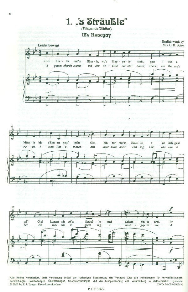 Ubber, Christian, ed 's Sträussle Die Lerche Sonntagsruhe Rosenringel Jager und Senn'rin Romanze Liebesorakel Dein grünes stilles Tal Kennt ihr die Heimat trauter Seelenlust Wiegenlied Oi' Schwalb' macht koi'n Sommer Die Schwalbe Ein Lied von de Wet Am Rhein Zeitlied Rosmarin Unter der Linde Verratene Liebe Das Waldvöglein