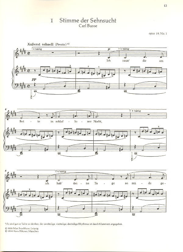 RECTANUS, HANS, ED 2 LIEDER OP.19 (CARL BUSSE) STIMME DER SEHNSUCHT MICHAELSKIRCHPLATZ 2 LIEDER OP.21 HERBSTLIED (F. HEBBEL) DIE NACHTIGALLEN (EICHENDORFF) 5 LIEDER OP.22 IN DANZIG (EICHENDORFF) TRAGISCHE GESCHICHTE (CHAMISSO) SCHOEN SUSCHEN (G.A. BUERGER) GEGENLIEBE (BUERGER) AN DIE BIENEN (BUERGER) 4 LIEDER OP.24 UNTER DER LINDEN (WALTHER VON DER VOGELWEIDE) GEWALT DER MINNE (WALTHER VON DER VOGELWEIDE) 92. SONETTE (PETRARCA) ABENDROT (F. LIENHARD) 5 LIEDER OP.26 GEBET (F. HEBBEL) NACHTS (EICENDORFF) TREUE LIEBE (EICHENDORFF) TRAUERSTILLE (G.A. BUERGER) MAILIED (GOETHE) 4 LIEDER OP.29 ABBITTE (HOELDERLIN) HERBSTHAUCH (RUECKERT) WILLKOMMEN UND ABSCHIED (GOETHE) DIE STILEL STADT (DEHMEL) 4 LIEDER OP.30 SEHNSUCHT NACH VERGESSEN (N. LENAU) DAS VERLASSENE MAEGDLEIN (MOERIKE) DENK ES O SEELE (MOERIKE) DER ARBEITSMANN (DEHMEL) 4 LIEDER OP.32 (ALLE CONRAD FERDINAND MEYER) HUSSENS KERKER SAEERSPRUCH EINGELEGTE RUDER LASS SCHARREN DEINER ROSSE HUF 8 LIEDER OP.33 (ALLE GOTTFRIED KELLER) MIR GLAENZEN DIE AUGEN ICH FUERCHT' NIT GESPENSTER DU MILCHJUNGER KNABE WANDL' ICH IN DEM MORGENTAU SING MEIN SCHATZ WIE EN FINK ROESCHEN BISS DEN APFEL AN TRETET EIN HOHER KRIEGER WIE GLAENZT DER HELL MOND 6 LIEDER OP.35 (ALLE RICARDA HUCH) BESTIMMUNG ICH WERDE NICHT AN DEINEM HERZEN SATT WO HAST DU ALL DIE SCHOENHEIT HERGENOMMEN SCHWILL AN MEIN STROM EINE MELODIE SINGT MEIN HERZ DENN UNSRE LIEBE HAT ZU GLEISS GEFLAMMT 6 LIEDER OP.40 LEUCHTENDE TAGE (L. JACOBOWSKI) WENN SICH LIEBES VON DIE LOESEN WILL (A. BARTELS) SEHNSUCHT (R. HUCH) HERBSTGEFUEHL (M. GREIF) WANDERERS NACHTLIED (GOETHE) DER WECKRUF (EICHENDORFF) 3 SONETTE OP.41 AUF DIE MORGENROETE (G.A. BUERGER) DER VERSPAETETE WANDERER (EICHENDORFF) DAS ALTER (EICHENDORFF)