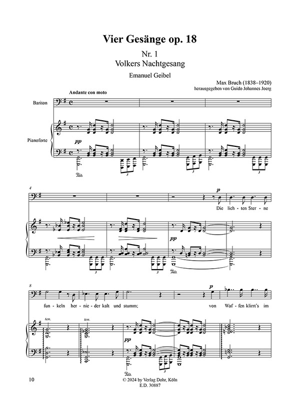 Denkmäler rheinischer Musik Band 51 Gesänge op. 18 (1865) Nr. 1 Volkers Nachtgesang (Geibel) Nr. 2 Der Landsknecht (Geibel) Nr. 3 An die heilige Jungfrau (O Vírgen, que á Dios pariste) (Heyse) Nr. 4 Provençalisches Liebeslied (Can la frej aura venta) (Heyse) Lieder op. 33 (1869/1870) Nr. 1 Biterolf im Lager vor Akkon (1190) (Scheffel) Nr. 2 Altdeutscher Herbstreigen (Scheffel) Nr. 3 Dein gedenk ich, Margaretha (Scheffel) Nr. 4 Lind duftig hält die Maiennacht (Scheffel) Lieder und Gesänge op. 49 (1882) Heft I Nr. 1 Frage Lied des Rugantino (Question) (Goethe) Nr. 2 Der Einsiedler (To the night) (Eichendorff) Nr. 3 Ungarisch (Hungarian dirge) Nr. 4 Serenade (Kruse) Heft II Nr. 5 Weg der Liebe Erster Teil (Love will find out the way First part) (Herder) Nr. 6 Weg der Liebe Zweiter Teil (Love will find out the way Second part) (Herder) Nr. 7 Kleonikes letzter Wille (Kleonikes last request) (Kruse) Lieder und Gesänge op. 54 (1889/1891). Siechentrost Solace in affliction (Heyse) Nr. 1 Lied Im Volkston (Folk-Song) Nr. 2 Lied (Song) Nr. 3 Duett (Duette) Nr. 4 Duett (Duette) Nr. 5 Schlussgesang (Quartett) (Finale) Frühling im Moseltal (Spring in the Mosel Valley) Siechentrosts Ende (Siechentrosts death) Lieder op. 59 (1891/1892) Nr. 1 Um Mitternacht (Mörike) Nr. 2 Kophtisches Lied (Goethe) Nr. 3 Zweites Kophtisches Lied (Goethe) Nr. 4 Die Auswanderer I. Flucht (Stieler) Nr. 5 Die Auswanderer II. Heimatbild (Stieler) Lieder op. 97 (1920/1921) Nr. 1 Mein Liebchen naht, Blumen zu pflücken (When my dear one comes) (Geibel) Nr. 2 Durch die wolkige Maiennacht (Through the haze of the cloudy night) (Geibel) Nr. 3 Vor dem Fenster mir (Neath my window ledge) (Margarete Bruch) Nr. 4 Morgenlied (Morning Song) (Goethe) Nr. 5 Ein Mädchen und ein Gläschen Wein (A maiden fair and sparkling wine) (Goethe) Anhang Lied der Deutschen in Österreich (Winter) Das Japsenlied (Margarete Bruch) Der Band enthält neben einem Vorwort zudem einen ausführlichen kritischen Bericht sowie den Abdruck sämtlicher vertonter Texte mit einer Dokumentation von Abweichungen zwischen Original und Vertonung sowie für einige Lieder nicht vertonte Strophen und originalsprachige Vorlagen. Parallel zur vorliegenden Denkmäler-Ausgabe erscheinen die Lieder Max Bruchs auch in einer vierbändigen praktischen Ausgabe. Die Lieder des vorliegenden Denkmäler-Bandes verteilen sich auf Band 1 und 2 der praktischen Ausgabe, die beiden erstmals gedruckten Lieder des Anhangs sind lediglich in der Denkmäler-Ausgabe enthalten.