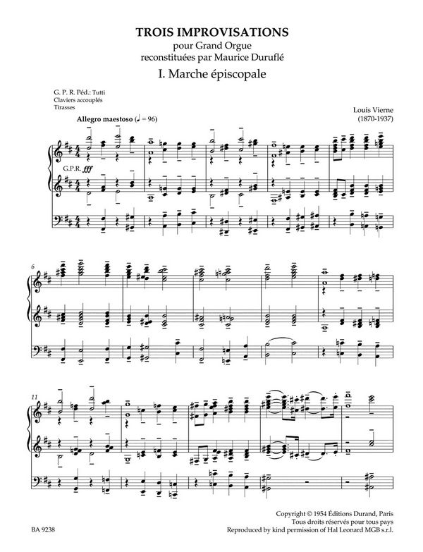 Schauerte-Maubouet, Helga, ed 1. Improvisationen: Drei Improvisationen (rekonstruiert 1954 von Maurice Duruflé) Improvisation (rekonstruiert 2005 von Jean-Michel Louchart) 2. Transkriptionen: Johann Sebastian Bach, Sicilienne BWV1031 (1894) (2. Satz der Sonate Es-Dur für Flöte und Cembalo) César Franck, 5 Pièces d'harmonium (1901) Serge Rachmaninoff, Prélude cis-Moll op.3,2 (1932) (aus: Morceaux de fantaisie)