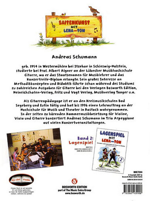 Ensemble- und Lagenschule Saitenkunst mit Lena und Tom 1 baut auf der Serie Gitarrespielen mit Lena und Tom auf bzw. ergänzt diese und führt die kleinen Schüler weiter auf dem Weg mit ihrem Instrument. Die Schule richtet sich an Gitarrenpädagogen und deren Gitarrenschüler im Alter von etwa 7-11 Jahren, sowohl im Einzel- als auch im Gruppenunterricht. Dabei stehen vor allem das gemeinsame Spiel mit verteilten Stimmen sowie die Vorbereitung auf das Lagenspiel im Vordergrund. Die Schule folgt in ihrer Konzeption, wie auch die Vorgängerreihe Gitarrespielen mit Lena und Tom, ganz bewusst der traditionellen und bewährten Gitarrenpädagogik, sowohl in der grafischen Gestaltung als auch dem methodischen Aufbau. Das Notenbild ist groß und übersichtlich gehalten, dazu gibt es viele Illustrationen und Erläuterungen zu den Übungen und Stücken. Sämtliche Lehrinhalte werden direkt durch Musikstücke erläutert. Themenliste: Grundhaltung, einfache Übungen auf den Einzelsaiten, Notenwerte & Pausenzeichen, Basisakkorde (G, D7, C, a, E), Wechselschlag, Achtelnoten, Tirando, Pendelanschlag, Tonleitern, Arpeggien, Punktierungen, Triolen und Sechzehntel, zweistimmiges Spiel, die 1. Lage und Lagenspiel auf einer Saite, Lagenwechselübungen usw.