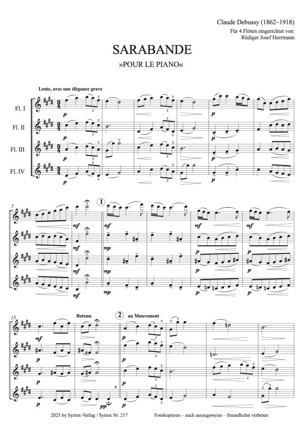 Vorwort Mit den vorliegenden Flötenquartett-Fassungen von Debussys »SARABANDE« (Pour le piano, 1894/1901) und Ravels »PAVANE pour une ínfante défunte« (1899) setzt der SYRINX-Verlag die Reihe seiner pädagogisch intendierten Ensemble-Arrangements fort, wobei in gegenwärtiger Adaption impressionistischer Klavierwerke der klanglich-harmonische Aspekt und die agogische Varianz an erster Stelle stehen. Zeichnet sich der Impressionismus zunächst als »Eindruckskunst« (fr. impression = Eindruck) in der Malerei durch das momentane Festhalten einer Stimmung oder eines charakteristischen Augenblicks aus, wobei die jeweiligen Konturen an Umriss-Schärfe verlieren, die Linien sich auflösen und im Dunst verschwimmen, so wird analog auch in der impressionistischen Musik das atmosphärisch-Unbestimmte, das nicht-Greifbare, das farbig-Tonmalerische, kurz das Sfumato zum Prinzip. Und so ist der musikalische Impressionismus eine Musik der Klangfarben, der harmonischen Reize, einer Harmonik, die manchmal ihre tonal-funktionalen Zusammenhänge auflöst und »malerisch« Klänge um ihrer selbst willen nebeneinanderstellt. Um unmittelbar auf die Sinne einzuwirken, werden gleichfalls mehr oder weniger oft die Taktschwerpunkte durch rhythmische Unbestimmtheiten verschleiert. Diese »Farbigkeit« des Spiels, die von jedem der vier ausführenden Flötisten verlangt wird, gepaart mit einer mal individuellen, mal gemeinsamen Gestaltung des Tempos in allen Stimmen, kann hier gezielt geübt werden. So soll zum Klangfarbenspiel auf der Flöte angeregt und ebenfalls zur Freiheit beim musikalischen Vortrag ermuntert werden. Beide Flötenadaptionen gehen auf Orchesterfassungen zurück, die Maurice Ravel im Nachhinein anfertigte: 1910 instrumentierte er seine »PAVANE« für kleines Orchester, 1922 folgte Debussys »SARABANDE«. Um bei den Arrangements die Original-Tonarten beibehalten zu können, war die Verwendung eines H-Fußes (Debussy: 4. Stimme / Ravel: alle Stimmen) nicht zu umgehen. Besonderer Dank gebührt meinem ehemaligen Studienkollegen, dem Komponisten, Pianisten und Dirigenten Franck Adrian Holzkamp, der sich in liebenswürdiger Weise der Durchsicht und, wo nötig, der Korrektur dieser Arrangements angenommen hat. Dr. Rüdiger Josef Herrmann Pullach i. Isartal, Juni 2023