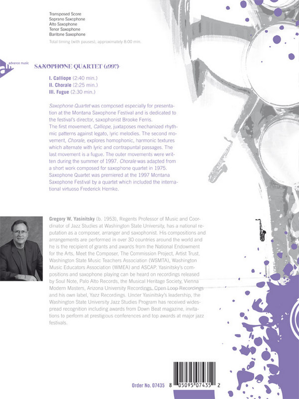 | Untertitel: | for 4 Saxophones (SATBar) Partitur und Stimmen |