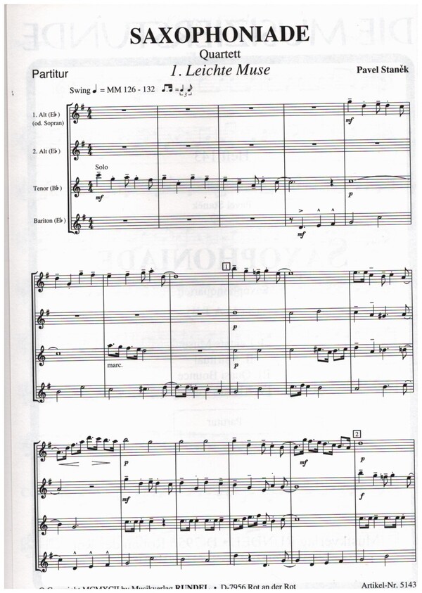 | Untertitel: | für 4 Saxophone (S(A)ATBar) Partitur und Stimmen |