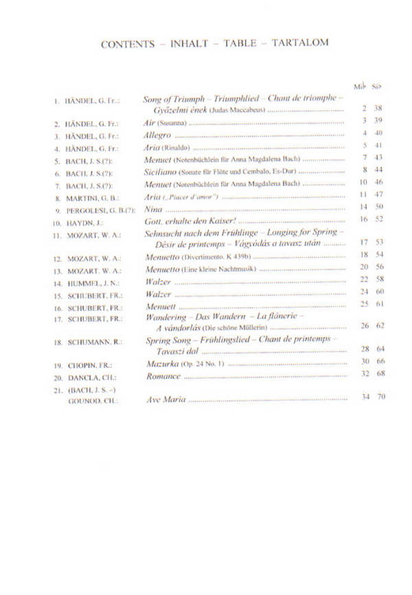 KRASZNA, LASZLO, ED SAXOPHONE MUSIC FOR BEGINNERS ENTHAELT 1 SOLOSTIMME UND 2 KLAVIERBEGLEITUNGEN TRIUMPHLIED (HAENDEL) AIR, ALLEGRO UND ARIA (HAENDEL) 2 MENUETTE UND SICILIANO (BACH) ARIA (MARTINI) NINA (PERGOLESI) GOTT ERHALTE DEN KAISER (HAYDN) SEHNSUCHT NACH DEM FRUEHLING (MOZART) 2 MENUETTE (MOZART) WALZER (HUMMEL) WALZER UND MENUETT (SCHUBERT) DAS WANDERN (SCHUBERT) FRUEHLINGSLIED (SCHUMANN) MAZURKA (CHOPIN) ROMANCE (DANCLA) AVE MARIA (BACH - GOUNOD)