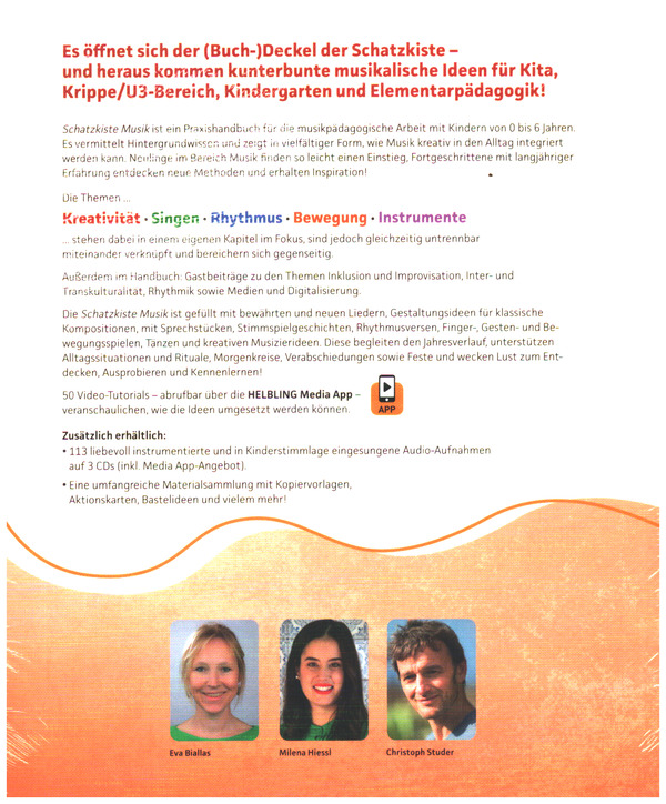 Ob Neulinge oder Fortgeschrittene im Bereich Musik: In der 'Schatzkiste Musik' werden alle Fachkräfte fündig, die mit Kindern von 0 bis 6 Jahren arbeiten. Im Praxishandbuch vermitteln Eva Biallas, Milena Hiessl und Christoph Studer nicht nur Hintergrundwissen, sondern zeigen anhand zahlreicher praktischer Beispiele, wie Musik in die verschiedenen Bereiche des Alltags integriert werden kann. Dabei stehen diese Themen jeweils in einem eigenen Kapitel im Fokus: - Kreativität - Singen - Rhythmus - Bewegung - Instrumente Zu jedem Kapitel gibt es in der zweiten Hälfte des Buches einen umfangreichen Praxisschatz mit zahlreichen weiteren Ideen, Liedern und Sprechstücken. Gastautorinnen bieten darüber hinaus Einblicke in die wichtigen Themen Inklusion und Improvisation, Inter- und Transkulturalität, Rhythmik sowie Medien und Digitalisierung.