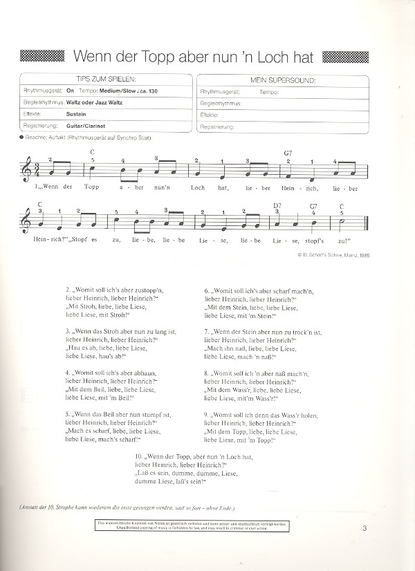 Keyboard Klangwelt Boarder, Steve, arr. Auf de schwäbsche Eisebahne Bolle reiste jüngst zu Pfingsten die Leineweber Die Vogelhochzeit Drei Chinesen mit dem kontrabaß Drei Eskimos Drunt in der grünen Au Eine Seefahrt die ist lustig Ein Mann der sich Kolumbus nannt Es lebt der Eisbär in Sibirien Herrn Pastor sin Kauh In einen Harung jung und schlank Ja so warn's die alten Rittersleut Jetzt singen wir das Trullala Meine Oma fährt im Hühnerstall Motorrad Papst und Sultan Schnadahüpfln Stumpfsinn du mein Vergnügen Wenn der Topp aber nun 'n Loch hat Wo mag denn nur mein Christian sein